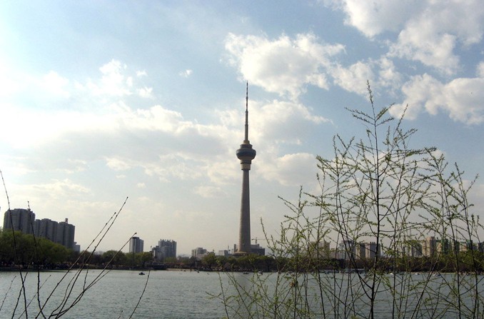 公園西湖水面開(kāi)闊,波光粼粼,站在中堤西望中央電視發(fā)射塔倒影于湖中,在粼光中搖曳,在碧波中浮游。