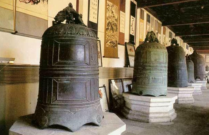 大鐘樓東面的庭院里陳列著40余口古鐘,最早的是宋代熙寧年間鑄造的,距今900多年。按年代順沿分別有宋、元、明、清各代古鐘。藏經(jīng)樓一樓是古鐘簡(jiǎn)史陳列廳。展品中最小的香煙盒大小的陶鐘,是距今五六千年前的最古老之鐘。展品中的精品有商代青銅鐘、三件一組的編鐘,西周編鐘、春秋編鐘、早商青銅鈴、西周合瓦形編鐘,曾候工編鐘等。