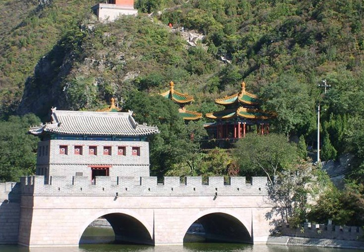 4.軍事防御范圍廣,周圍面積50多公頃,南北券城相距約850米左右,東山頂至西山頂直線距離1150米,防御設施有南、北券城、城樓、水門、水閘、敵樓、鋪房、烽隧、角樓、炮臺等。長城上的敵樓、烽燧、鋪房,是古代打仗時作為掩體和士兵居住的地方,共修復了25座,這些按明代規(guī)制燒的城磚,都是靠人工、牲畜往上運送材料。高大雄偉的城樓,南北各有一座,樓為三重檐歇山式綠琉璃瓦翦邊,高21米,下面城臺高10米。城樓是指揮作戰(zhàn)的中心,所以建造高大。站在樓上,可以一目了然,有利于觀敵情。城臺下面有券門通甕城。甕城即大城門外的月城,用以增強城池的防御力量。