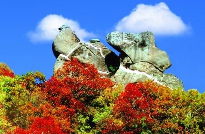 在白樺林附近,游路邊的山峰頂部,兩塊巨石狀如鴛鴦相依相偎。關(guān)于鴛鴦石,在當(dāng)?shù)剡€流傳著動人五岳寨-鴛鴦石的神話傳說。