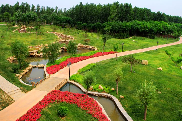 該公園以河為中心,在河兩岸種植蘆葦、蒲草,形成的濱水綠帶。用地總面積 4500畝,其中,水面積1000畝,綠化面積(人工改造部分)500畝?,F(xiàn)種植各類(lèi)苗木110多萬(wàn)株、其中喬木1.5萬(wàn)株,灌木40萬(wàn)株,地被植物21萬(wàn)株,水生植物45萬(wàn)株,綠化工程投資120 萬(wàn)元。常綠樹(shù)4種有雪松、黑松、龍柏、黃楊等;落葉樹(shù)20多種,如國(guó)槐、垂柳、合歡、苦楝等;藤本及地被植物有迎春、月季、凌霄、五葉地錦等;宿根花卉及應(yīng)時(shí)花卉10多種,水生植物10多種。