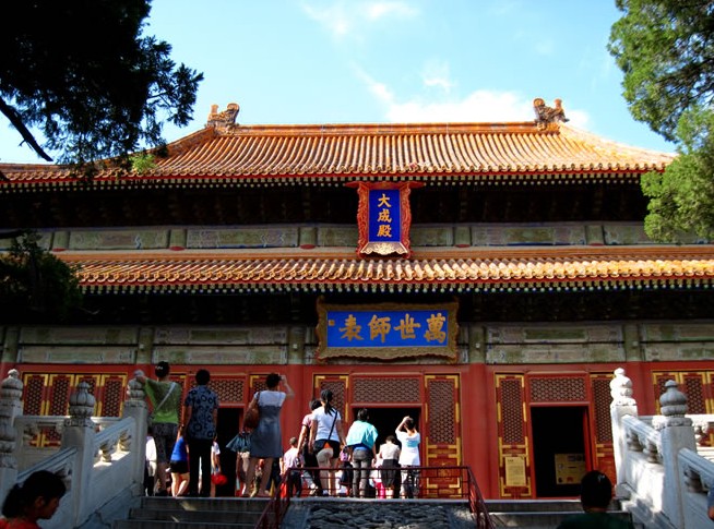 從杏壇北望,在雙層石欄的臺基上一座金黃色的大殿突兀凌空,雙重飛檐中海藍(lán)色的豎匾上木刻貼金的群龍緊緊團護著3個金色大字“大成殿”。字徑1米,為清雍正皇帝手書。大成殿是孔廟的主殿,高24.8米,闊45.78米,深24.89米,重檐九 脊,黃瓦飛甍,周繞回廊,和故宮太和殿、岱廟宋天貺殿并稱為東方三大殿。大殿結(jié)構(gòu)簡潔整齊,重檐飛翹,斗栱交錯,雕梁畫棟,金碧輝煌,藻井枋檁飾以云龍圖案,金箔貼裹,祥云繚繞,群龍競飛。四周廊下環(huán)立28根雕龍石柱,均以整石刻成。柱高5.98米,直徑0.81米,承以重層寶裝覆蓮柱礎(chǔ),原為明弘治十三年(公元1500年)敕調(diào)徽州工匠刻制,清雍正二年火 后重刻。兩山及后檐的18根八棱磨淺雕石柱,以云龍為飾,每面淺刻9條團龍,每柱72條,細(xì)心的工匠在石柱上記下了雕刻的龍的總數(shù),共1296條。前檐的10根為深浮雕,每柱兩龍對翔,盤繞升騰,中刻寶珠,四繞云焰,柱腳綴以山石,襯以波濤。10根龍柱兩兩相對,各具變化。無一雷同,造型優(yōu)美生動,雕刻玲瓏剔透,刀法剛勁有力,龍姿栩栩如生。這是曲阜獨有的石刻藝術(shù)瑰寶,據(jù)說清乾隆皇帝來曲阜祭祀孔子時,石柱均用紅綾包裹,不敢被皇帝看到,恐怕皇帝會因超過皇宮而怪罪。大成殿的建筑藝術(shù),充分顯示了我國勞動人民的才華和智慧。 大成殿內(nèi)正中供奉孔子塑像,坐高3.35米,頭戴十二旒冠冕,身穿十二章王服,手捧鎮(zhèn)圭,一如古代天子禮制。兩側(cè)為四配,東位西向的是復(fù)圣顏回和述圣孔伋,西位東向的是宗圣曾參和亞圣孟軻。再外為十二哲,東位西向的是閔損、冉雍、端木賜、仲由、卜商、有若,西位東向的是冉耕、宰予、冉求、言偃、顓孫師、朱熹。四配塑像坐高2.6米,十二哲塑像坐高2米,均頭戴九旒冠,身穿九章,服,手執(zhí)躬圭,一如古代上公禮制。塑像都置于木制貼金神龕內(nèi),孔子像單龕,施十三踩斗栱,龕前兩柱各雕一條降龍,繞柱盤旋,姿態(tài)生動,雕刻玲瓏,異常精美。四配十二哲兩位一龕,各施九踩斗栱。龕前都有供桌、香案、擺滿祭祀時使用的籩、豆、爵等禮器。殿內(nèi)還陳列著祭祀孔子時中和韶樂樂器和舞具。殿外懸有10塊匾額、3副對聯(lián),門外正中是清雍正皇帝題書的“生民未有”匾額,殿內(nèi)正中是康熙皇帝題書的“萬世師表”和光緒皇帝題書的“斯文在茲”匾額,南面懸掛著乾隆皇帝題書的“時中立極”等匾額。每塊匾額長6米多,高約2.6米,雕龍貼金,精美華麗。