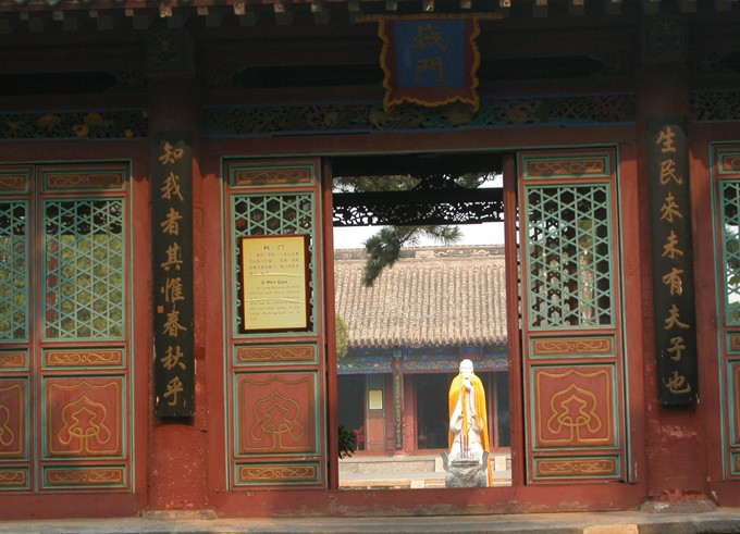 橋南東西二門,甬道相連,東匾“快睹門”,取李渤“如景星鳳凰,爭先睹之”語,即“先睹為快”之意;西匾“仰高門”取自《論語》“仰之彌高”語,贊頌孔子學(xué)問十分高深。此是孔廟的第二道偏門。過去只有皇帝祭祀才可走正門,一般人只駔從仰高門進廟。
