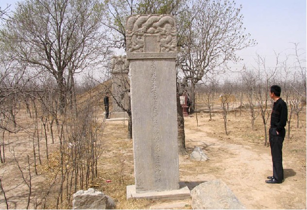 墓碑原地現(xiàn)墳丘東21米處,碑下基石上,有一片石灰混合土夯實地基,上鋪198×82厘米的兩塊青石板?,F(xiàn)尚存一塊,1989年修復墓地時鋪于墓碑之下。墓石合二為一,周邊有雕花。其上是一個巨型赑屃(石龜),已毀。從基石上還可看出石龜?shù)淖?。爪間距離前后爪距160厘米,左右爪距120厘米。赑屃背馱墓碑,碑冠已毀。從碑座到碑冠,整個墓碑通高5米左右。
