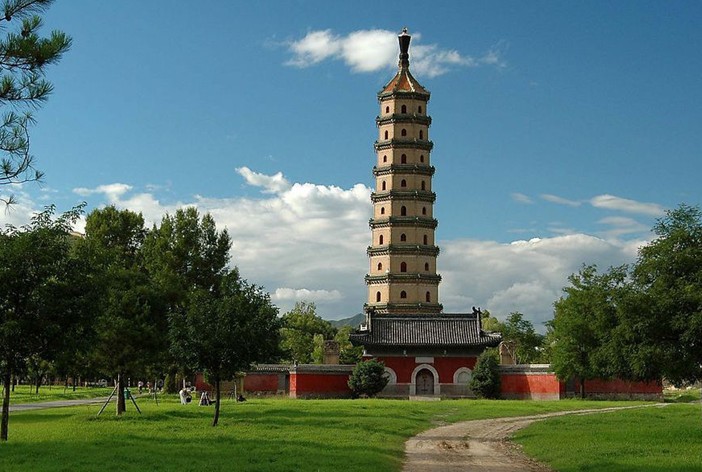 普陀宗乘之廟位于避暑山莊正北。普陀宗乘是藏語(yǔ)布達(dá)拉宮的漢譯,故又稱(chēng)小布達(dá)拉宮。建于清乾隆三十二年(1767年),歷經(jīng)4年完工,仿西藏布達(dá)拉宮形制,廟的建筑布局利用山勢(shì),自南而北層層升高。主要建筑有山門(mén)、碑亭、五塔門(mén)、琉璃牌坊、大紅臺(tái)、萬(wàn)法歸一殿等。大紅臺(tái)為主體建筑,臺(tái)高42.5米,寬59.7米。萬(wàn)法師一殿在大紅臺(tái)中部,重檐四角攢尖鎏金瓦頂。此廟是外八廟最大的一處,占地面積約22萬(wàn)平方米。廟內(nèi)共有大小建筑約60處,多是平頂白墻。主體建筑大紅臺(tái)是一座暗紅色的方形建筑,在周?chē)咨珮怯畹挠骋r下,非常搶眼。大紅臺(tái)中心的萬(wàn)法歸一殿頂部全部被鎏金銅瓦所覆蓋,僅此一項(xiàng)造價(jià)即是黃金萬(wàn)兩,這里是舉行重大的宗教儀式或清帝接見(jiàn)重要的少數(shù)民族部落首領(lǐng)及王公大臣們的場(chǎng)所。普陀宗乘之廟古木參天,環(huán)境清幽,景致殊佳,是外八廟中不可不游的一處。