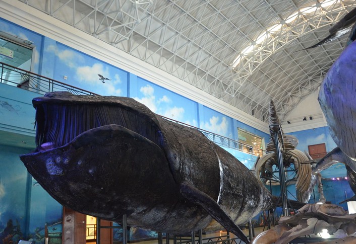 巨鯨展廳的展示主題是“海洋巨獸”。巨鯨是地球上現(xiàn)生的最大動物。幾個(gè)世紀(jì)以來,由于世界各地沿海國家的大規(guī)模捕殺活動,使巨鯨的資源遭到了嚴(yán)重破壞,其種群數(shù)量正在銳減,有的鯨類數(shù)量已到了難以恢復(fù)的境地,甚至面臨滅絕的危險(xiǎn)。體型碩大的巨鯨令人驚奇且著迷,人們一生中很難有機(jī)會親眼見到這些龐然大物。本展廳展示了我館收藏的部分巨鯨外形和骨骼標(biāo)本,有重達(dá)66.7噸的黑露脊鯨、52噸重的抹香鯨和34.7噸重的長須鯨等,這些館藏標(biāo)本在世界各地的其他博物館都難得一見。