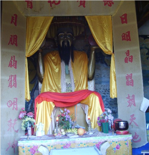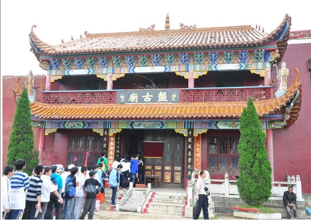 地處河北省滄州市北的青縣城南6公里有村曰“大盤古”,村西有座盤古廟。盤古廟始建于元世祖至元十五年(1278年),明弘治和崇禎年間曾重修,清康熙二十七年(1688年)因河流沖刷,設(shè)于秋祠西南重建,均有碑記。據(jù)文獻(xiàn)記載和民間傳說,當(dāng)年的盤古廟狀似北京的故宮三殿,石、磚、木結(jié)構(gòu),琉璃瓦蓋頂,金碧輝煌,蔚為壯觀。前殿高三丈六尺,象征一年360天;臺(tái)階18級(jí),為18層地獄之說;飛檐椽子108根,按36天罡、72地煞而布;每根椽頭系銅鈴一枚,照工、商、角、征、羽五音而置,有所謂“風(fēng)搖鈴響天動(dòng)樂,光照殿頂?shù)厣x”之說。殿內(nèi)有身披樹葉,手托日月的鐵鑄涂金盤古像,高一丈零八寸。中殿塑有南海觀音像,股坐蓮盆,金童玉女立兩側(cè)。版權(quán)所有山東聊城聊之旅國際旅行社有限公司,轉(zhuǎn)載必究!后殿設(shè)老君、孔子、龍王三塑像,殿前有合抱粗的合歡樹兩株,殿后鐵磬懸于古槐??上ПP古廟在1947年毀于戰(zhàn)火。九十年代,當(dāng)?shù)厝罕娊M織起來修復(fù)盤古勝跡,以滿足來此朝圣拜祖的人流尋訪。