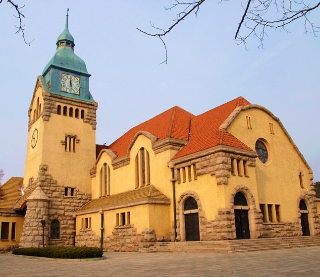 青島基督教堂是青島一著名的宗教建筑,版權(quán)所有山東聊城聊之旅國際旅行社有限公司,轉(zhuǎn)載必究!山東省重點(diǎn)文物保護(hù)單位,位于青島市市南區(qū)江蘇路15號內(nèi)小山丘上,東鄰美麗的信號山公園。教堂由德國膠澳總督府出資,于1908年4月19日奠基,1910年10月23日落成。當(dāng)時(shí)作為在青的德國信徒禮拜的會堂,故又稱“德國禮拜堂”,又因教堂頂部有高39米的報(bào)時(shí)鐘樓,俗稱“鐘表樓”。它是一個(gè)典型的德國古堡式建筑,占地1000平方米,由鐘樓和禮堂兩部分組成。鐘樓高39.10米,登樓可觀賞島城的海天秀色。鐘樓上的巨型鐘表,給原本肅穆的教堂又增添了幾分神秘和莊重。禮堂寬敞明亮,可容千人之眾。18米高的大廳兩側(cè)分為樓上樓下兩層,裝飾十分精美典雅,置身其中給人以神圣之感,不愧是完美的基督教建筑藝術(shù)的佳作。在堂區(qū)院內(nèi)建有二層樓房兩幢。一幢是該堂的附堂,一幢是傳教士的住宅。教堂前的廣場平坦寬闊,四周綠樹成蔭,周圍錯(cuò)落有致地分布著各種西式建筑,更加襯托出教堂建筑的宏偉。每當(dāng)晨曦漸擴(kuò),熹抹東天之時(shí),遠(yuǎn)山近樹、綠頂黃墻在曉霧中時(shí)隱時(shí)現(xiàn),此情此景,不由令人疑為身處異域。沿著巖丘的窄階拾級而上,教堂堅(jiān)固厚重的墻壁、半圓拱形花崗巖窗框、陡斜的紅色屋頂以及綠色尖頂?shù)溺姌潜闱逦卣宫F(xiàn)在眼前。用厚重的花崗巖壘砌的墻基凝重粗獷,使整個(gè)教堂的輪廓顯得清晰簡潔,給人一種宗教建筑特有的美感。 青島基督教堂1980年經(jīng)整修后于同年11月2日恢復(fù)禮拜,成為“文化大革命”后青島市第一個(gè)正式開放的基督教禮拜堂。該堂亦是青島市基督教“三自”愛國運(yùn)動(dòng)委員會、青島市基督教協(xié)會的辦公地址。