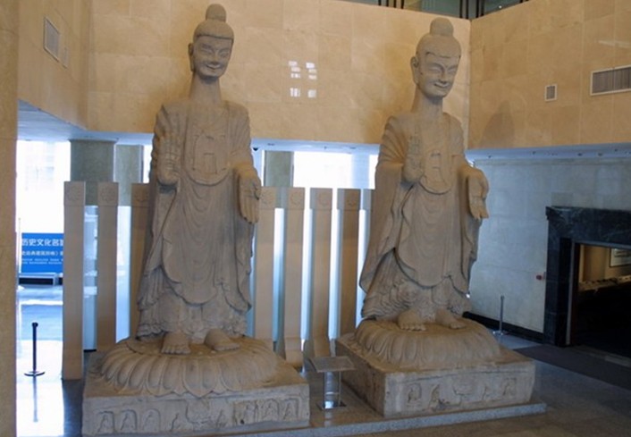 在青島歷史文化博物館的正門大廳內(nèi),矗立著兩尊北魏(公元500—550年)時期的石佛像,距今已有1500余年的歷史。佛像身高一丈八尺,重約30噸,俗稱“丈八佛”。頭部雕高肉髻,面部瘦削清秀,深目高鼻,眉間有白毫相,其神態(tài)祥和、超然。長頸,內(nèi)著僧祗支,胸前束僧祗支帶,外披褒衣博帶式長衣,衣紋雕刻成“v”形斷面。雙手施無畏與愿印。跣足立于蓮花座上,蓮座下雕四方形的須彌座。石佛像造型優(yōu)美,雕刻技法嫻熟,衣紋細(xì)致柔和,神態(tài)栩栩如生。充分表現(xiàn)出北魏孝文帝漢化政策的施行,反映到佛教雕塑藝術(shù)上的風(fēng)格特點(diǎn)。兩尊石佛像最早安放在山東臨淄縣龍泉寺內(nèi)。