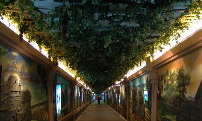 走進(jìn)博物館的大門,首先映入眼簾的是一條通道,通道兩邊的墻壁上掛滿了各種宣傳櫥窗,在壁燈、吊燈的照耀下閃爍出五光十色的色彩,為了安全,博物館的工作人員在通道的頂部安裝了鋼紗網(wǎng),小細(xì)節(jié)體現(xiàn)出博物館工作人員的縝密與仔細(xì)。整個博物館以葡萄酒為主題,追溯了葡萄酒的起源和歷史,展現(xiàn)了葡萄酒的文化與品質(zhì)。在這里,真實再現(xiàn)了葡萄從種植到釀造成美酒的全過程及工藝流程,通過這些展品,使我這個對葡萄酒不太懂的門外漢也開始對葡萄酒有了初步的了解。