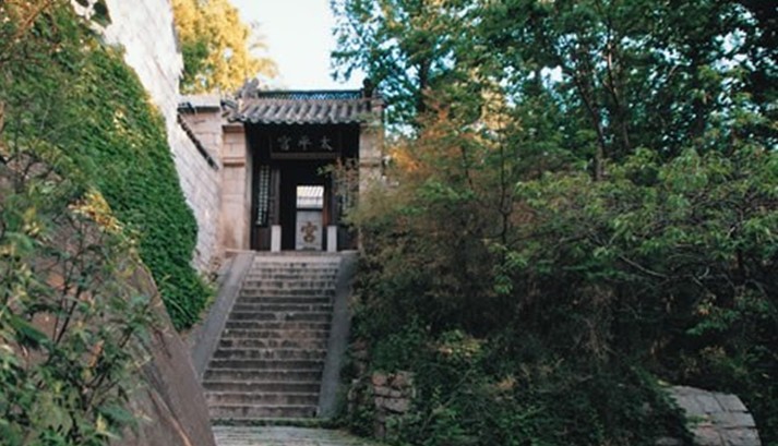太平宮初名太平興國院,又稱上苑。系宋太祖為華蓋真人劉若拙敕建道場,金明昌年間(公元1190~1195年)重修。正殿名三清殿,配殿為三官殿和真武殿,坐落在嶗山東部上苑山北麓、仰口灣畔。 宮西絕壁矗立,下有天然石洞。洞內(nèi)縱橫各數(shù)丈,高敞如廈;洞頂鐫刻“混元石”三字及星斗圖案;洞旁眠龍石上,鐫“猶龍洞”三字。宮北山坡下有澗水噴涌,相傳曾有農(nóng)人見白龍游泳其中,名白龍澗。澗底巨石累累,橫跨兩岸,水從石隙下瀉,稱仙人橋。過橋山坡有巨石,上刻邱處機詠嶗山七絕20首及序。 宮東北奇峰突起,形同巨獅,張嘴作怒吼狀,名獅子峰。峰巔崗巒平敞,云氣彌漫,有“獅嶺橫云”勝景。