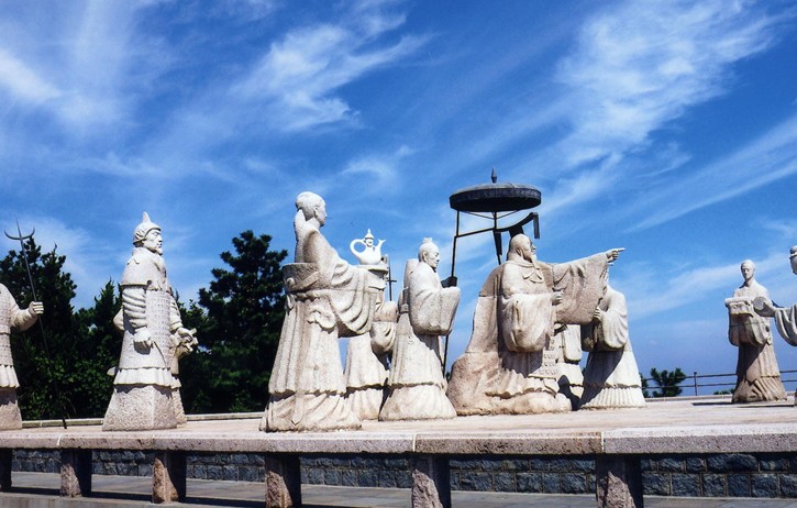 在瑯琊臺(tái)頂,共有石雕像14尊:秦始皇、徐福、胡亥、李斯、趙高和文武官員、武士、侍女、侍從等。群雕生動(dòng)地表現(xiàn)了公元前210年秦始皇第三次巡游瑯琊時(shí),徐福向秦始皇講述海上求仙經(jīng)過的場(chǎng)面。版權(quán)所有山東聊城聊之旅國際旅行社有限公司,轉(zhuǎn)載必究!作品的整體氣韻與古臺(tái)、高天、大海和群山的背景渾然融合而又相互襯托,氣勢(shì)宏大。群雕把一個(gè)充滿傳奇色彩的歷史場(chǎng)面燦然凝固在瑯琊臺(tái)上。