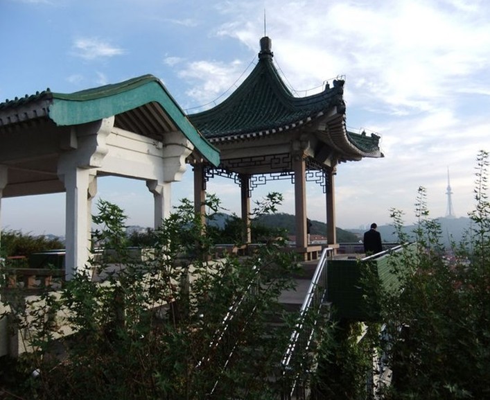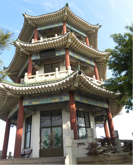 我們從小魚(yú)山的大門(mén)抬階而上,看到的這個(gè)亭子是一個(gè)挑檐式的六角亭,在亭內(nèi)可以把碧波蕩漾的匯泉灣一覽無(wú)余,故得名“碧波亭”。“碧波亭”的匾額“碧波”二字是由著名的國(guó)畫(huà)藝術(shù)大師吳作人手書(shū)的。大家看遠(yuǎn)處的山上有三棟紅色蘑菇樓宛如三柄熊熊燃燒的火炬,那是青島市十大山頭公園之一的信號(hào)山公園。在半山腰綠樹(shù)叢中的那棟別具特色的建筑是青島市迎賓館,原是“德國(guó)總督府官邸”。我們?cè)儆?ldquo;碧波亭”拾階而上,站護(hù)欄邊可以看到右下邊有兩幢民族式建筑,一座形如城樓,一座貌似宮殿,那就是青島市海產(chǎn)博物館。