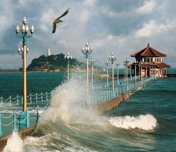 棧橋是青島的象征。位于青島灣中,與市內(nèi)最繁華的中山路成一條直線,由海岸前伸入海,素有“長虹遠引”之美譽。棧橋初建于光緒十八年(公元1892年),是青島最早的碼頭。經(jīng)1931年改建和1985年整修,現(xiàn)寬8米,全長440米。版權(quán)所有山東聊城聊之旅國際旅行社有限公司,轉(zhuǎn)載必究!橋南端筑半圓形防波堤,堤內(nèi)是一座具有民族風格的兩層八角亭,金瓦朱壁,盔頂飛檐,題名“回瀾閣”。棧橋劃波斬浪,像一條長龍橫臥于碧海銀波。循橋漸入,仿佛走進大海的懷抱;佇立閣旁,層層巨浪澎湃涌來,拍打堤壩,擊起萬千碎玉;入閣內(nèi),沿螺旋樓梯登到樓上,四周盡是寬敞的大窗,放眼望去,又是另一番怡人風景,“飛閣回瀾”因此被譽為“青島十景”之一。