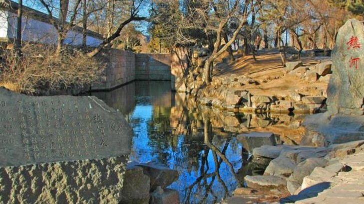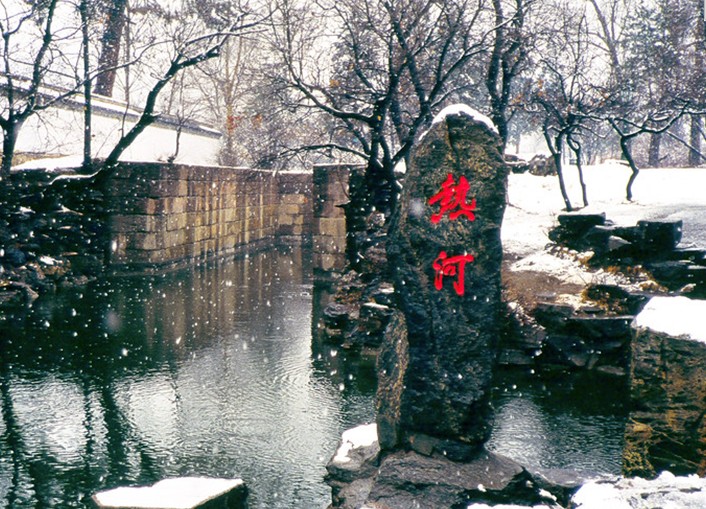 位于避暑山莊湖區(qū)東北隅,是山莊湖泊的主要水源。清澈的泉水從地下涌出,流經(jīng)澄湖、如意湖、上湖、下湖,自銀湖南部的五孔閘流出,沿長堤匯入武烈河。熱河全長700多米,在一般地圖上找不到它有蹤跡。它是中國最短的河流。熱河發(fā)源于避暑山莊諸泉的一條涓涓細(xì)流,主要水源來自熱河泉。冬季水溫為8℃。泉側(cè)有巨石,刻“熱河”兩字。