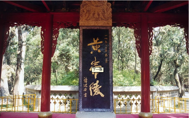 再北為誠心亭。面闊五間。進深一間。祭祀官員至此須整飾衣冠,靜心凈面,方可進入大殿祭祀。再北為碑亭,面闊五間,進深一間,卷棚頂。亭內(nèi)立有毛澤東手跡“祭黃帝陵文”和蔣中正手跡“黃帝陵”碑石。