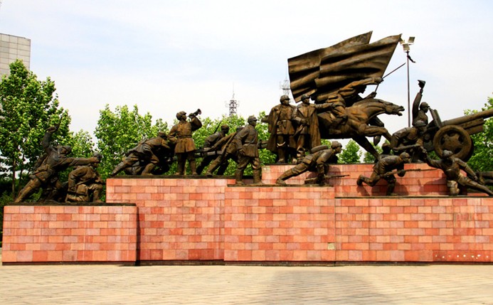 紀(jì)念廣場總體環(huán)境藝術(shù)以勝利為主旋律。兩根高大花崗巖圓柱構(gòu)成勝利門,柱頂分別佇立著人民解放軍東北野戰(zhàn)軍和華北軍區(qū)部隊?wèi)?zhàn)士雕像。兩壁反映軍民團(tuán)結(jié)奮戰(zhàn)、歡慶勝利的花崗巖浮雕墻分列勝利門兩旁。廣場中央豎立著高64米的勝利紀(jì)念碑,不銹鋼三冷刺刀直插云霄。廣場東西兩側(cè)的大型鍛銅群雕,烘托出人民戰(zhàn)爭的磅礴氣勢。