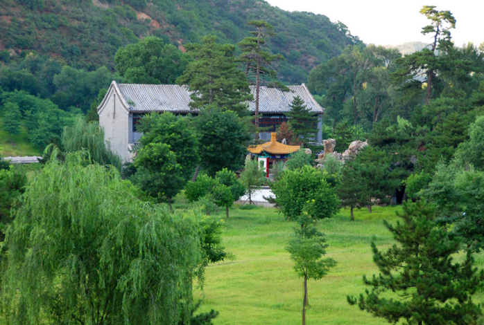 閣東有碑亭一座,立《文津閣碑記》一通。文津閣建筑手法科學(xué),外觀兩層重檐,內(nèi)部三層結(jié)構(gòu),中間夾層能防止陽光直射。所謂《易經(jīng)》“天一生水,地六成之”的精巧設(shè)計(jì)。上懸乾隆帝御書“文津閣”匾額。閣前有平臺(tái),臺(tái)下池水,池水南為假山疊石,疊石設(shè)計(jì)奇特,暗隱縫隙,折射入池水中,形成倒映的彎月,成為山莊一絕。
