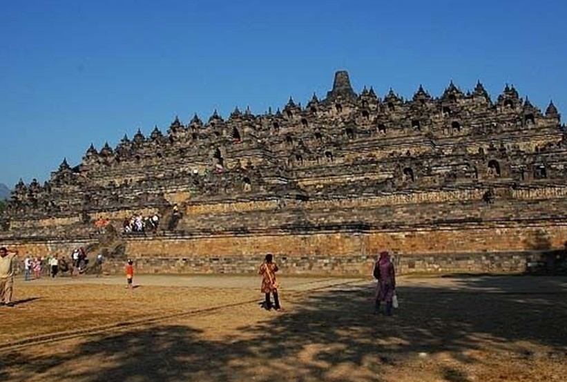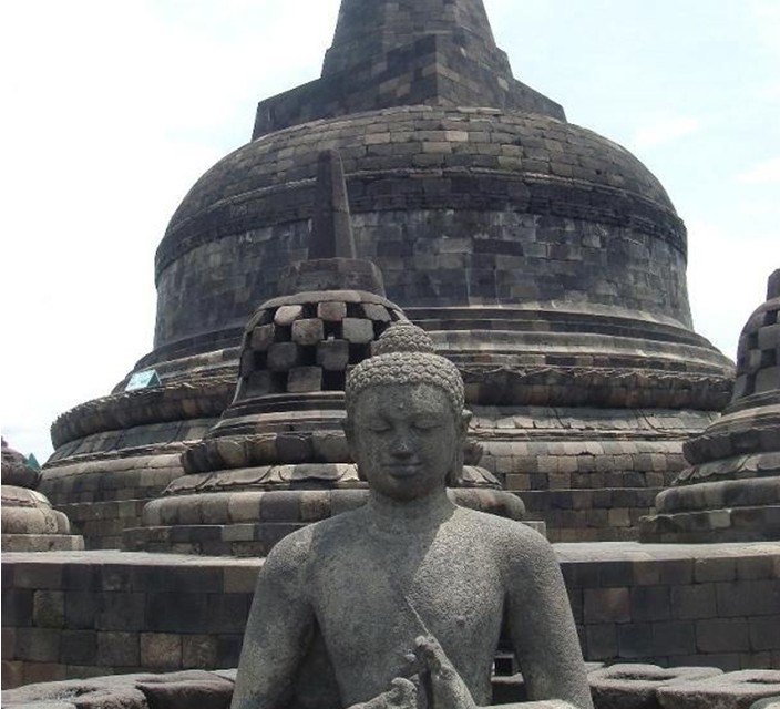 婆羅浮屠位于印度尼西亞,大約于公元750年至850年間,由當(dāng)時統(tǒng)治爪哇島的夏連特拉王朝統(tǒng)治者興建。“婆羅浮屠”這個名字的意思很可能來自梵語"Vihara Buddha Ur",意思就是“山頂?shù)姆鹚?rdquo;。后來因為火山爆發(fā),使這佛塔群下沉、并隱蓋于茂密的熱帶叢林中近千年,直到19世紀(jì)初才被清理出來。與中國的長城、印度的泰姬陵、柬埔寨的吳哥窟并稱為古代東方四大奇跡。