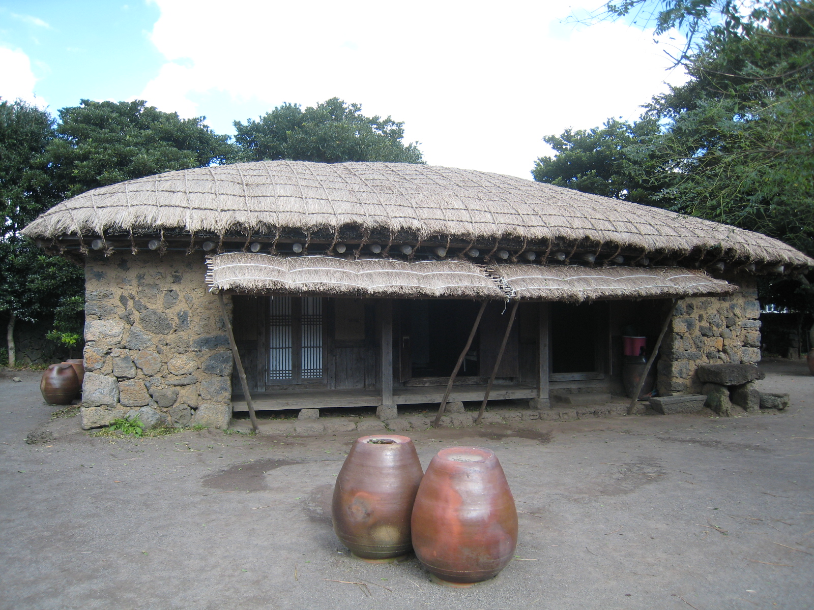 城邑民俗村由于位于濟(jì)州島上,因而也完全反映了濟(jì)州島獨(dú)特的居住文化。你在這里可以看到那看似堆得稀稀疏疏的擋風(fēng)石墻(黑熔巖石),為了防止風(fēng)直接進(jìn)入里屋而建得又直又彎的“奧來”(窄胡同),還有成為濟(jì)州島之象征的石神像(Dolharubang)。濟(jì)州島特有的東西中尤為有名的是黑毛的土種豬和“通西”(豬圈兼廁所)。這里的土種豬吃人糞,其營(yíng)養(yǎng)豐富,肉味可口,十分有名。這里都是現(xiàn)代社會(huì)已難得一見的傳統(tǒng),因而更增添了幾分別樣風(fēng)味。