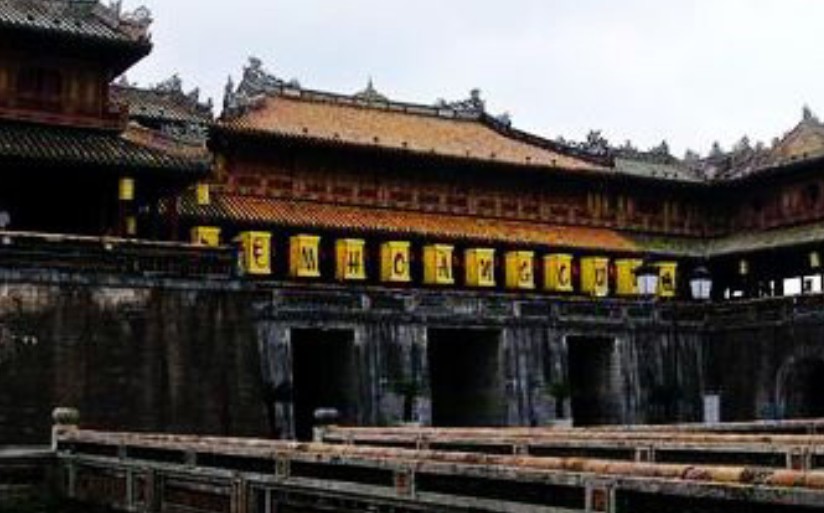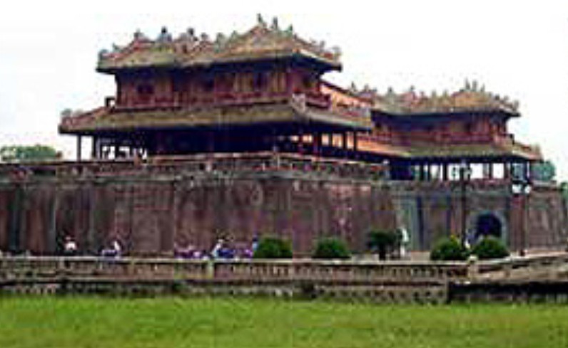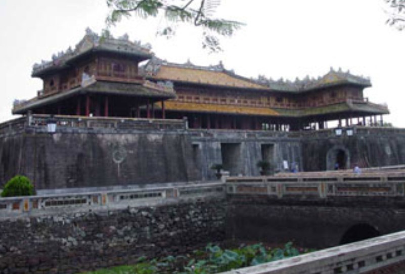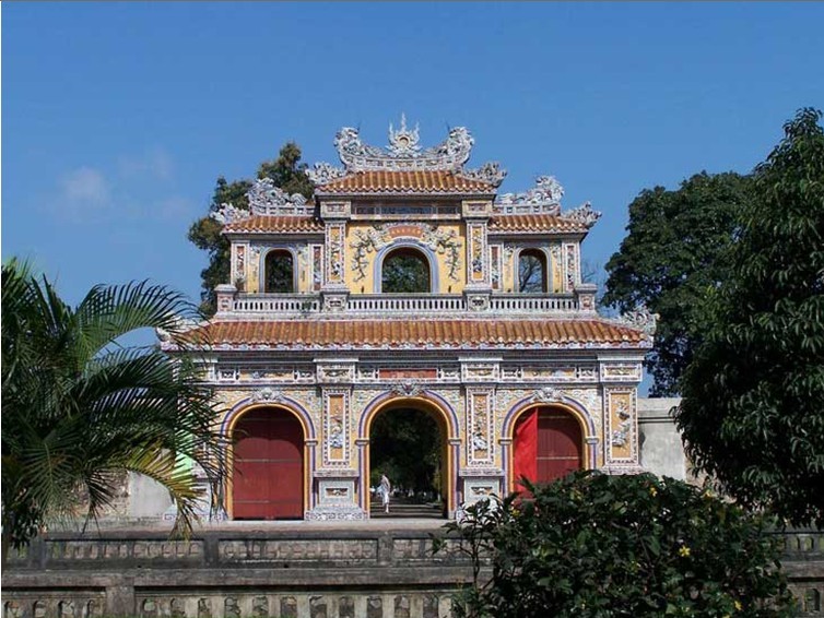 越南順化故宮正門(mén)。規(guī)模比中國(guó)北京故宮的午門(mén)小,但其式樣基本一樣。平面呈冂形,下有高大的磚石墩臺(tái),臺(tái)正面圍以垛墻。墩臺(tái)有5門(mén),正中門(mén)高5.32米,寬3.28米,門(mén)正中上方有“午門(mén)”兩個(gè)大字。當(dāng)初字外包金,1943年12月10日包金被竊。墩臺(tái)上建樓5座,名五鳳樓,樓分兩層,氣勢(shì)巍峨。下層正中是“御座”。上層為各宮人觀禮之所。當(dāng)時(shí),午門(mén)只在慶典節(jié)日開(kāi)放。午門(mén)也是阮氏王朝被埋葬的見(jiàn)證,1945年8月30日阮朝末代皇帝被迫在此正式宣布遜位,并把金印和寶劍交給越南臨時(shí)政府代表團(tuán)。午門(mén)建于阮朝明命十四年(公元1833年),啟定三年(1921年)重修??箲?zhàn)期間遭炮火破壞,現(xiàn)已修復(fù)。以前,阮朝嘉隆初年曾在午門(mén)現(xiàn)址建有南闕臺(tái)。