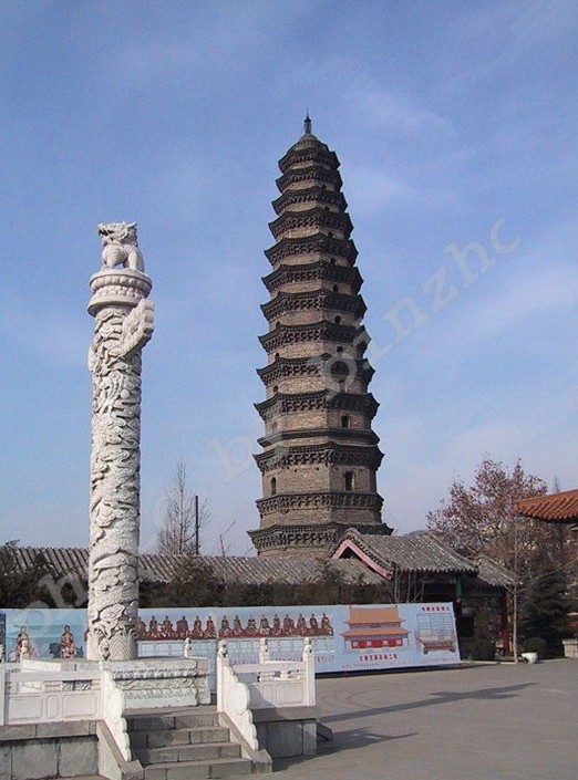 七寶塔在山西平順縣城西北23公里大云寺前。周顯德元年(公元 954年)建。通體用堅(jiān)硬青石雕造。原為七層,現(xiàn)存五層,高為六米。下三層平面八角形。第一層雕寶裝蓮花、獅子、麒麟、飛馬等。第二層雕伎樂人,體態(tài)輕盈,舞姿優(yōu)美,伴奏者栩栩如生。第三層轉(zhuǎn)角處雕絞龍柱,回旋盤繞。塔檐下飛鳳、飛仙、共命鳥等變化多姿。