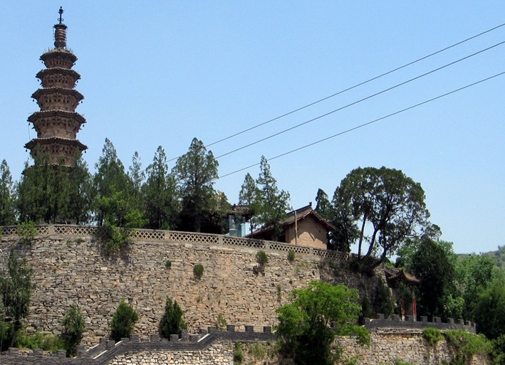 原起寺始建于唐天寶六年(747),后經(jīng)歷代維修擴(kuò)建,成為唐宋混合結(jié)構(gòu),寺院周圍磚砌花欄圍墻,坐北朝南。院中主殿大雄寶殿及佛殿三間,琉璃九脊屋蓋,飛檐斗拱,雅致古樸 ,十分壯觀。殿內(nèi)橫柱、荊梁尤為珍貴。殿前有四根方形石柱撐起一座正方形香亭,每根亭柱上刻有詩(shī)文一句,共成七言絕句一首:“霧迷塔影煙迷寺,暮聽鐘聲夜聽潮;飛閣流丹臨極地,層巒聳翠出重霄。”前后兩句分別又構(gòu)成了兩副工整的對(duì)聯(lián)。亭前豎有八角青石經(jīng)幢一座,刻陀羅尼經(jīng)及建幢寺的銘記。幢座八面雕刻侍女樂(lè)人,風(fēng)姿動(dòng)人。香亭東有關(guān)公殿,西有閻王殿。 大雄寶殿西側(cè)聳立著北宋元佑二年(1087)建造的大圣寶塔(俗稱青龍寶塔)。塔身八角七級(jí),高17米,層層飛檐斗拱,節(jié)節(jié)精雕細(xì)刻,累累疊疊,巍峨凌云。塔頂安裝有八個(gè)鐵人,個(gè)個(gè)威風(fēng)凜凜,閃閃發(fā)光。每個(gè)挑角各掛有一只鐵鈴,總共56只,風(fēng)吹鈴響,叮呤不止,令人心曠神怡。