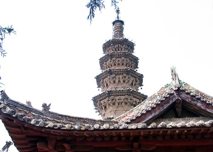 殿西矗立著北宋元祐二年(公元1087年)建造的大圣寶塔(俗稱青龍寶塔) 巍峨凌云。塔身八角七級(jí),高17米,層層飛檐斗拱,節(jié)節(jié)精雕細(xì)刻,形狀各異。塔頂八角安裝8個(gè)鐵人,個(gè)個(gè)威風(fēng)凜凜,閃閃發(fā)光。每個(gè)塔角各掛一個(gè)鐵鈴,風(fēng)映鈴響,叮鈴不止。