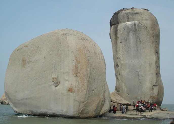 從看澳村岸邊坐渡船,十幾分鐘就到達(dá)礁石上,礁石底部是一組平坦完整的巖石。兩個(gè)石柱均由粗?;野咨幕◢弾r組成 東側(cè)的一個(gè)高達(dá)33米,胸寬9米,厚8米,周長57米;西側(cè)的一個(gè)高17米,胸寬15米,厚8米周長39.9米。兩個(gè)石柱的底部都是近似四方形體,直立在礁石上。據(jù)地質(zhì)學(xué)家考證是世界上最大的花崗巖球狀風(fēng)化海蝕柱。