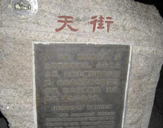 進(jìn)了南天門再上兩層臺階就是天街,天街自古以來就似懸在天上的一條街市。古代的香客,現(xiàn)在的游人都對這條街存有深刻的印象。在長約千米的天街上布滿了賓館、飯店、商鋪。據(jù)記載,天街從清代就開始繁華,當(dāng)時(shí)的一些店鋪老板用實(shí)物作為招牌,如“棒槌”、“木碗”、“鸚鵡”等。