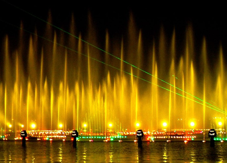 位于菱湖風景區(qū)北岸,總建筑面積102000平方米,沿湖岸的水面上建有木質親水平臺,平臺南側設有水景表演系統(tǒng),噴泉水幕總長380米,寬約100米,最大噴高128米,噴頭近3000個,水下彩燈5000盞,是國內目前規(guī)模最大的水幕電影系統(tǒng)之一。