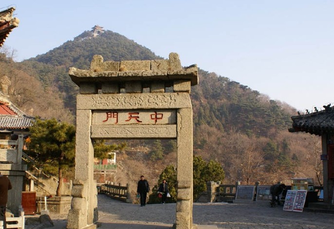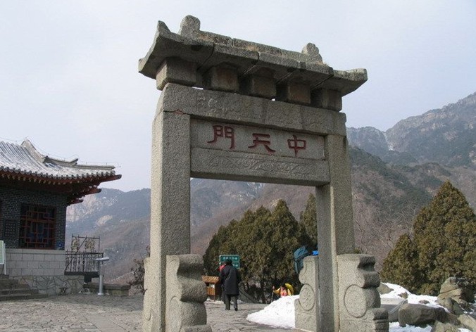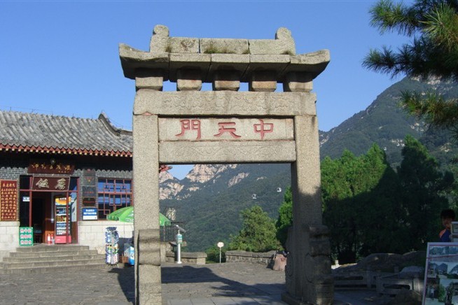 中天門建于清,為兩柱單門式石坊。泰山古時(shí)多虎,古人在坊北建廟祀黑虎神,現(xiàn)廟內(nèi)塑財(cái)神趙公元帥執(zhí)鞭跨虎,東為仿古茶樓,西南為中溪賓館,西北為中天門索道站。中天門峻嶺闊谷,樓閣簇?fù)怼|有中溪山突兀俏麗,可觀日出,望晚霞;西有鳳凰嶺蜿蜓伸展,可遠(yuǎn)眺傲徠雄姿,俯視城廓新貌。佇立坊下,北瞻巍巍岱峰,眾山拱立,林茂泉飛,纜車凌空,天然成畫。