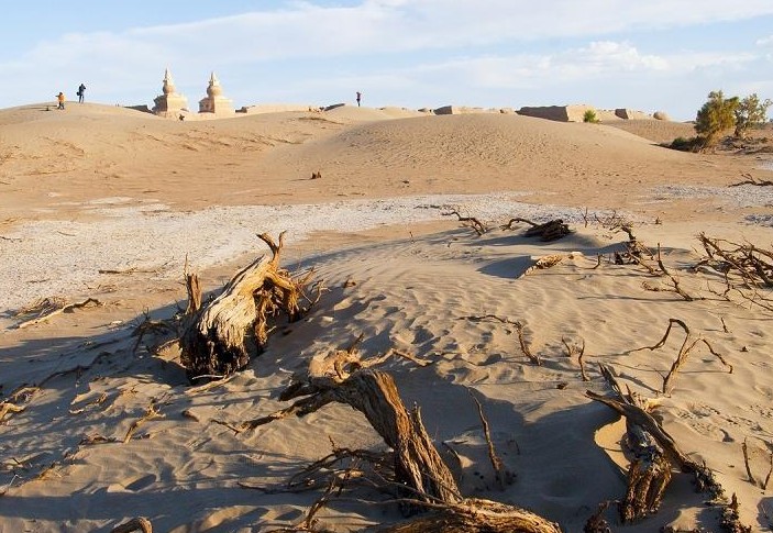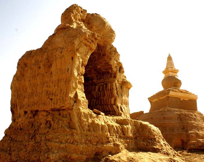1350年前后,這里的情況發(fā)生了巨大的變化。昔日的綠洲,被沙漠吞噬,變成了一片荒漠。昔日繁華昌盛的黑水城也變成了一座廢城?,F(xiàn)在它們的痕跡依稀可辨。磚石,瓦塊,陶瓷殘片,鐵器,雕刻,泥佛,風化的白骨,破裂的石磨,塊壘等當年的遺物。在古城遺址的西北角上,端坐著12米高的西藏覆缽式佛塔,古樸,圓融,安詳,是黑城的標志性建筑。城內(nèi),荒涼滿目,流沙下遍布官邸、寺廟和民居的頹垣斷壁,到處都散落著各種瓷器和碎片。黑釉刻花、白釉褐彩,以及鈞瓷和南方的龍泉瓷等等。城外還有幾座殘缺不全的喇嘛塔,像是守城的衛(wèi)士肅然而立。