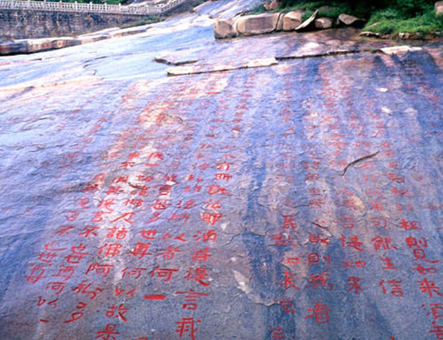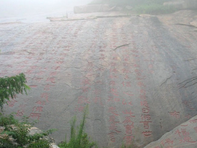 經(jīng)石峪金剛經(jīng)刻位于斗母宮東北經(jīng)石峪,是中國現(xiàn)存規(guī)模最大的佛經(jīng)摩崖刻石。 經(jīng)文刻于面積2064平方米的緩坡石坪上,自東而西刻《金剛般若波羅密經(jīng)》,采用后秦鳩摩羅什譯本,原本全1卷、32分目、5172字,經(jīng)刻只刻到15分目“特經(jīng)功德 兮”,計44行,每行125字或10字不等,凡2799字,字徑50厘米。經(jīng)刻歷千余年風(fēng) 雨剝蝕、山洪沖擊、游人踐踏、捶拓?zé)o度,已殘泐磨滅過半,現(xiàn)僅存經(jīng)文41行、 1069字(包括可認讀的殘字和雙勾字)。