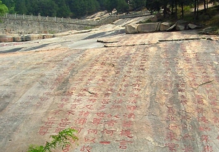 經(jīng)石峪位于泰山斗母宮東北,有岔路盤道相通,過漱玉橋、高山流水亭、神聆橋即至。峪中有緩坡石坪,上刻隸書《金剛經(jīng)》,俗稱曬經(jīng)石,明隆慶年間萬恭書刻“曝經(jīng)石”。