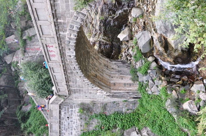 橋東有一座亭,觀瀑亭,又名酌泉亭,是清末泰安知縣所建。北側(cè)刻著一副對(duì)聯(lián):“且依石欄觀飛瀑,再渡云橋訪爵松。”橋周圍有“月色泉聲”、“云步躋天”、“絕飛流”、“聳壑昂霄”、“氣象巖巖”等題刻50余處,真、草、隸、篆,體法各一,琳瑯滿目。