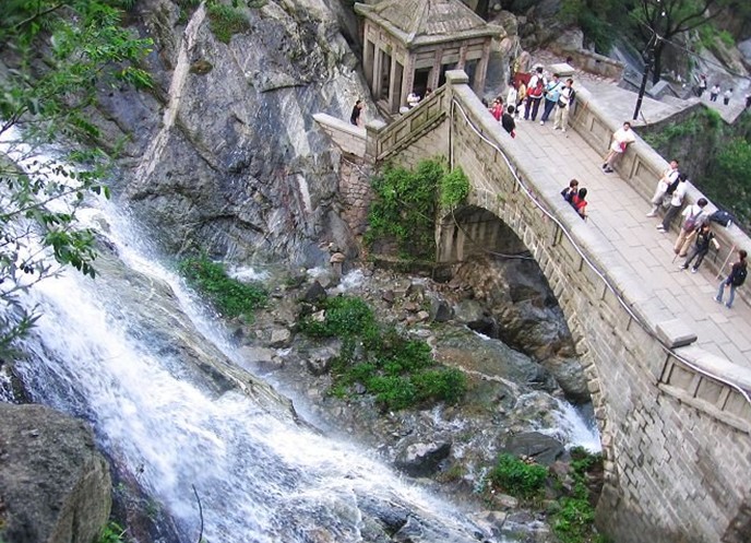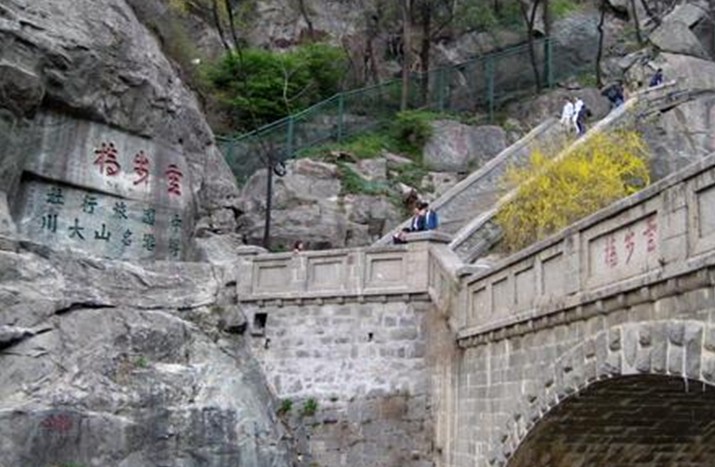 泰山旅游景點(diǎn)之一:在快活三里北首的云步橋,原來是木橋,叫雪花橋,民國年間改建石橋。這里林木茂盛山谷深幽,常為云霧籠罩,因此楊承訓(xùn)題名“云步橋”。