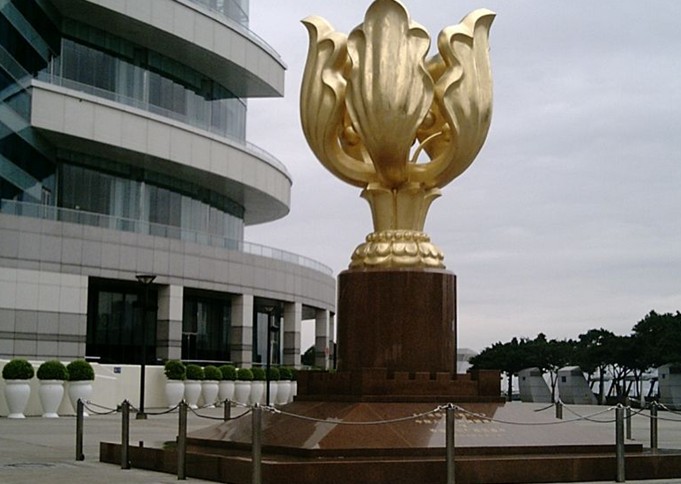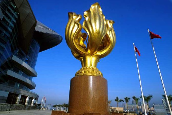 香港特別行政區(qū)成立后,中央政府把一座金紫荊雕塑送贈(zèng)香港,并安放在金紫荊廣場(chǎng)上,這朵紫荊花乃鍍金雕像,外表金光閃閃,于日光下發(fā)出耀眼金光。而且國(guó)旗及區(qū)旗每日早上八時(shí)于此處升起,并奏放國(guó)歌,吸引了大量游客至此觀看升旗禮。