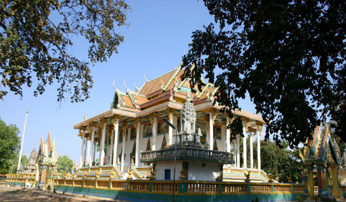 這座11世紀(jì)的寺廟在馬德望北面僅13公里處,廟前有一尊較新但引人注目的28米高的佛像;寺廟已經(jīng)破敗,看上去像“樂(lè)高”(Lego)拼裝玩具一樣搖搖欲墜。前往這里的公路兩邊棕櫚樹掩映,路邊的運(yùn)河兩側(cè)枝葉茂盛,村落處處,這條路本身就值得一游,尤其是在清晨或夕陽(yáng)西下之時(shí)。