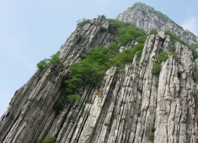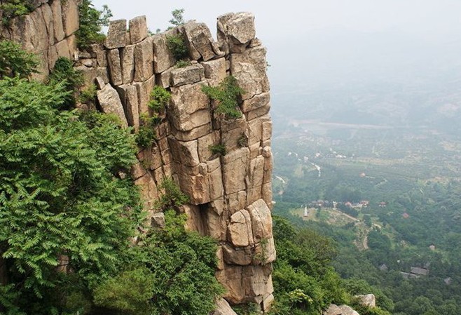 少室頂,其東北隅有石壁,版權(quán)所有山東聊城聊之旅國(guó)際旅行社有限公司,轉(zhuǎn)載必究!自山巔至底部一斧直削,高數(shù)百仞,俗稱“百丈崖”。崖間罅隙、石坎、孔穴頗多,是鳥類的安樂窩。每至晨夕,百鳥啁啾爭(zhēng)鳴,崖半翩翩飛舞,酷似一所“百鳥園”。循新修石階,攀至其巔,但見滿目玄巖怪石,樹木稀少,惟有矮小的側(cè)柏和荊棘灌叢,強(qiáng)生石縫間,點(diǎn)綴藍(lán)天懸峰。