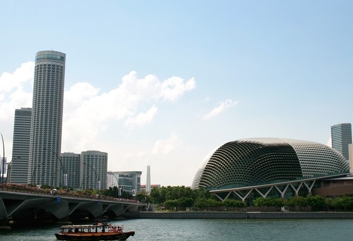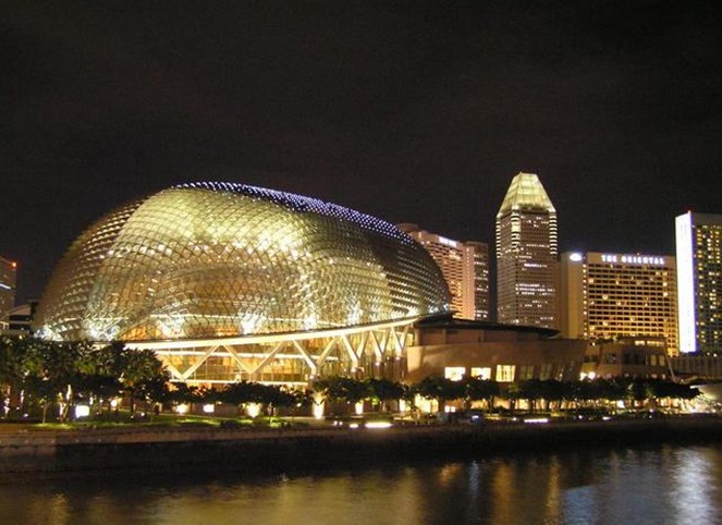 濱海藝術中心(The Esplanade),于2002年10月落成,是新加坡的地標建筑。外型奇特突出,宛若兩顆榴蓮,因此得名榴蓮藝術中心。但實質(zhì)上建筑師的靈感是采掘,根據(jù)蜻蜓的復眼來設計的。一開始可能感覺不到,當你看了濱海藝術中心的全景之后,可以越來越清晰地感到作者的想法及模仿蜻蜓復眼的逼真了。濱海藝術中心不僅外觀獨特,建筑物蘊含了不少的科學計算。它是由4,590片玻璃所組成的屋頂遮陽罩,依據(jù)新加坡日照環(huán)境的模擬計算設置。其內(nèi)部陳設卻充滿歐洲劇院風味,功能多元化,包含音樂廳、戲劇院、購物中心、餐廳及戶外表演空間等,讓東方與西方的藝術文化在此撞擊出最美的火花。