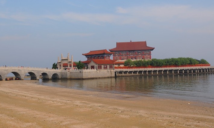 位于海水浴場東側(cè)海中,西與蓬萊遙遙相望的八仙渡??冢歉鶕?jù)八仙過海神話傳說填海新建的景區(qū),填海面積3.3萬平方米,如果從空中俯視恰似丫腰葫蘆一般。游龍起伏脊的南部外墻,龍首位于正門兩側(cè),墻體內(nèi)側(cè)嵌有諸神如甲子神、日游神、夜游神及生肖圖案等漢白玉浮雕70余方。景區(qū)內(nèi)建有民族風格古典式建筑的大型八仙過海漢白玉照壁、流軒、挹清軒、八仙祠、三星殿、財神殿、放鶴亭、環(huán)形步廊等,樹立各種雕塑20余尊,道教神仙100余尊奉伺在此。