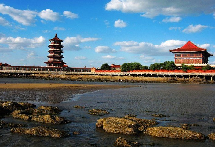 “望瀛樓”三個字是當代書壇泰斗啟功先生所題。據(jù)司馬遷《史記》記載,在東海之濱有三仙山,蓬萊、瀛洲、方丈,山上住著仙人,還有長生不老之藥,山上的亭臺樓閣均是黃金白玉所做,登此樓就可望到海上仙山。望瀛樓由六層組成,水上四層,水下兩層為海洋世界。海洋世界展示了幾百種珍奇的海洋生物,其中大海龜數(shù)十只,鯊魚有數(shù)百條,最大的有近3米長、重達300多斤,尤其是大鯊魚有了雅興,它格外慷慨的允許我們景區(qū)的潛水員和它手拉手一起遨游大海,令人嘆為觀止。