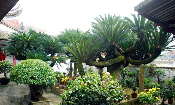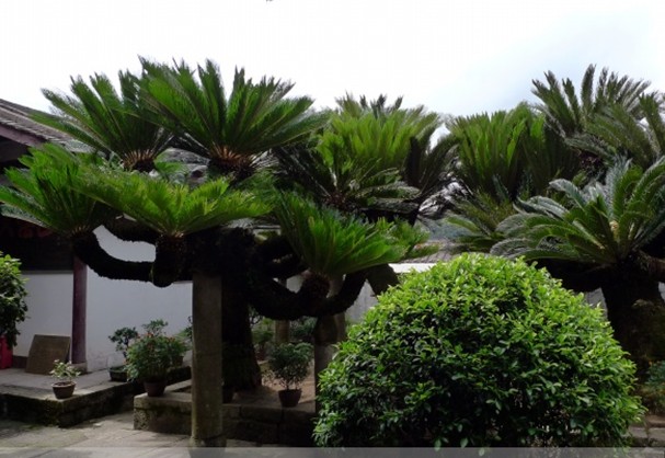 在方丈室的庭院內(nèi)種有三析鐵樹,相傳有兩株樹齡已超過一千年,其中一株為閩王王審知所種,一株是開山祖神宴法蚰所植。版權(quán)所有山東聊城聊之旅國際旅行社有限公司,轉(zhuǎn)載必究!1929年虛云老和尚應(yīng)當(dāng)時福建省主席楊幼京之請,回鼓山涌泉寺任住持,講經(jīng)傳戒、整頓寺規(guī)、創(chuàng)辦戒律學(xué)院,恢復(fù)禪堂規(guī)制,修建頹廢殿宇,整頓經(jīng)版文物,勛勞卓著。1930年,他為僧眾講《梵網(wǎng)經(jīng)》,恰逢兩株千年的鳳尾鐵樹開花,遠(yuǎn)近來觀乾,絡(luò)繹于道。當(dāng)時,聘任羯摩師文質(zhì)和尚撰小文記之:“庚午春(1930)值虛云兄主持石鼓,傳授戒法,余以隨喜之余,航海赴閩,參予盛典。既至。則鐵樹開花,繁茂無比,花大如盆,須瓣若鳳尾,咸以優(yōu)曇相慶。詢之耆日,皆言叟物也,其一為閩王手植,一為圣國師手植,迄今千載,敷此妙華,實(shí)為希有。邀虛兄?jǐn)z影留證,用志涌泉寺瑞應(yīng)焉。”是年虛云和尚已九十一歲了,方丈室鐵樹三株,兩雌一雄,雄花似小狐尾,雌花如黃絨球,真是奇觀,近期年年開花,游人可飽眼福。