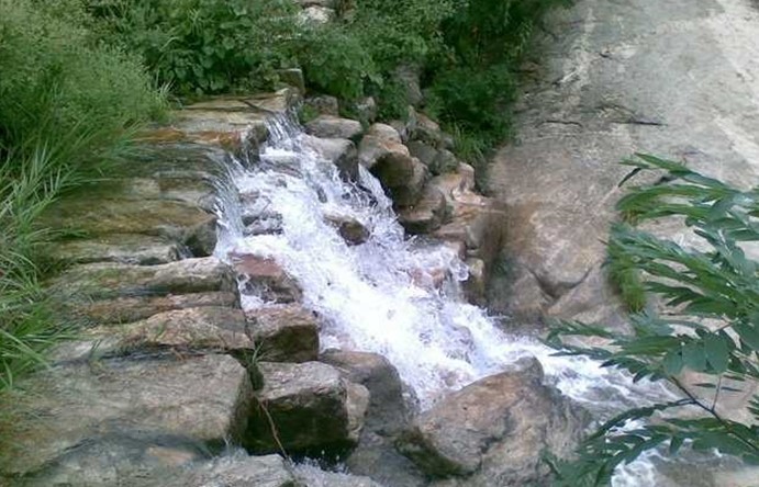 一股清泉從石縫涌出,涌上突兀的巖石,沿巨石涌入水潭。涓涓細(xì)流,或聚或散,有時如一片珠簾,隨風(fēng)飄灑,水簾在陽光映射下,時明時暗,耀著彩虹,下有一水潭,水面達(dá)2000平方米,山翠水清,石奇潭垂,一年四季皆有美景。