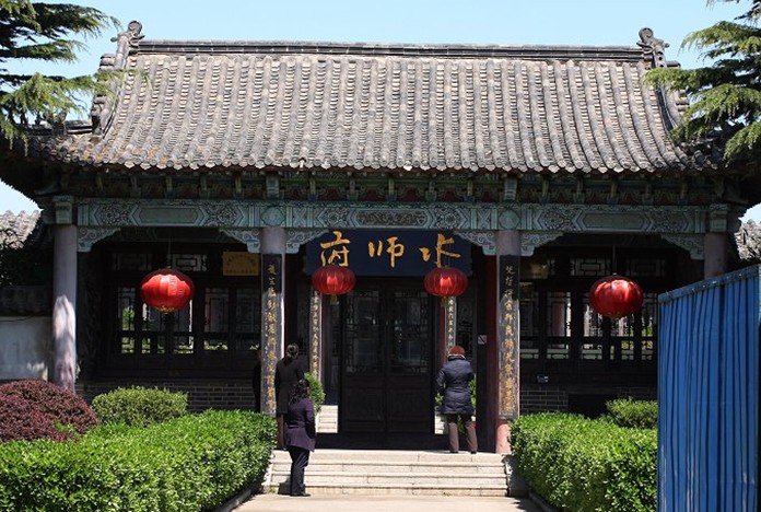 水師府位于振揚門北側,為中軸對稱二進式仿古建筑,座北朝南分布,占地 3220平方米,建筑面積1100平方米。大門南向,正對振揚門,東西兩側分別建有四柱斗拱飛檐碑亭,亭內分別立“忠”、“孝”字碑,二字相向。碑高皆三米,碑背分別刻戚繼光生平和戚景通(繼光父)生平。水師府為二進式院落,每進有正廳和東西廂房各一,且有回廊相連結。正廳、廂房皆單檐,琉璃瓦覆面,脊置六獸,皆有前明廊連于回廊。正廳屋面開山,廂房屋面歇山。