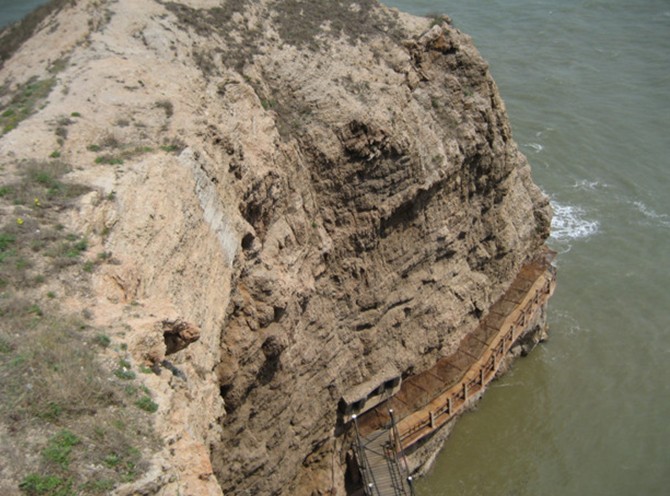 這里是被稱為膠東一絕的田橫棧道。棧道全長(zhǎng)220米,高2米,離崖壁地面20米,東起回仙洞,西抵老虎洞。