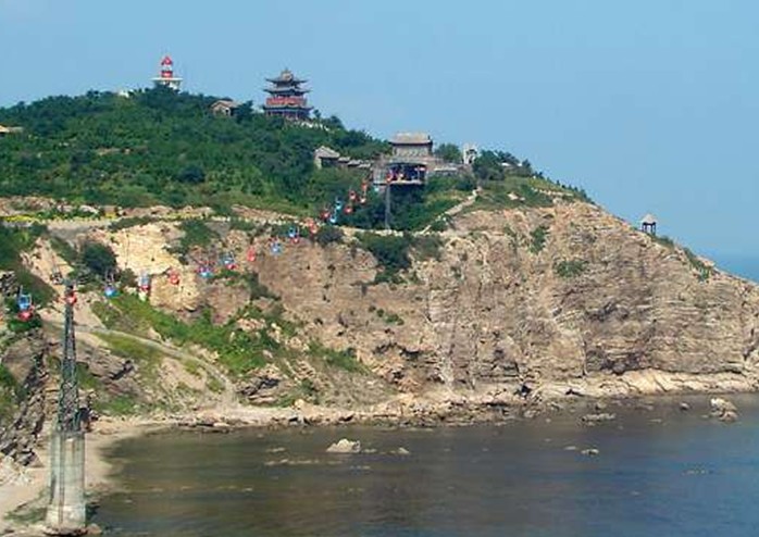 田橫山俗稱老北山,地處蓬萊陸地最北端,也是膠東半島最北端,這塊突入海中的陸地岬角稱為登州岬或蓬萊岬,是渤黃二海的分界處,具有“一山分二海”的獨(dú)特地理位置。東與丹崖山隔一小海灣相接,石壁高峻;西、北兩面半浸海中,形勢(shì)險(xiǎn)要。漢時(shí)韓信破齊,齊王田橫率其徒五百人東走,曾筑寨于此,因此得名。明萬歷二十一年(1594年),為鞏固海防,明廷調(diào)浙江兵卒于此戍守,在山上筑起城垣和署衙廨宇。清光緒二十年(1895年),中日甲午戰(zhàn)起,登州統(tǒng)領(lǐng)夏辛酉在山上筑起炮臺(tái),架起愛母斯郎炮數(shù)門,守護(hù)??冢鏋槁庙樦曉?。這里既有山海勝境,又有歷史遺跡,隨著旅游事業(yè)的發(fā)展,到這里探古覽勝的游人不斷增加。 1993年,田橫山與丹崖山之間架起了一條跨海索道,這里成為蓬萊閣旅游區(qū)的一個(gè)組成部分。在跨海索道上乘坐纜車,仰望前后兩側(cè)的仙山瓊閣,俯瞰大海的萬里澄波,聯(lián)想三神山的迷人神話,會(huì)不由自主地產(chǎn)生一種飄飄欲仙的感覺。(跨海索道全長(zhǎng)481米,高點(diǎn)海拔50.7米,相對(duì)落差26.3米,采用單循環(huán)半包吊椅式結(jié)構(gòu),共設(shè)纜座54個(gè),日可載客5340人次,是山東省第一條海上索道。它區(qū)別于其它索道的地方就是可以搭乘纜車領(lǐng)略海上風(fēng)光,在感受上是別有情趣的。