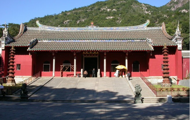 福州市鼓山涌泉寺為“閩剎之冠”,又是全國重點寺廟之一。寺建在海拔455米的鼓山山腰,前為香爐峰,后倚白云峰,有“進山不見寺,進寺不見山”的奇特建筑格局。相傳它的舊址為“華嚴寺”。唐建中四年(783年),有龍居靈源洞(《鼓山志》載:“其先為潭,毒龍居之?!保瑥氖屡犭姓J為“神物所蟠,宜寺以鎮(zhèn)之”,請高僧靈嶠入山誅茅設臺念《華嚴經(jīng)》,遂成華嚴寺,從此龍不為害。現(xiàn)在,人們都把建中四年(783年)作為涌泉寺創(chuàng)建之始?!√莆渥跍绶饡r,華嚴寺被毀。