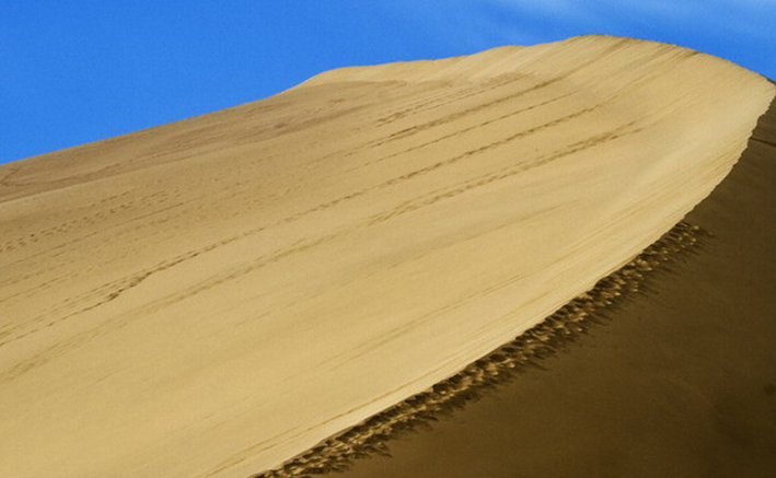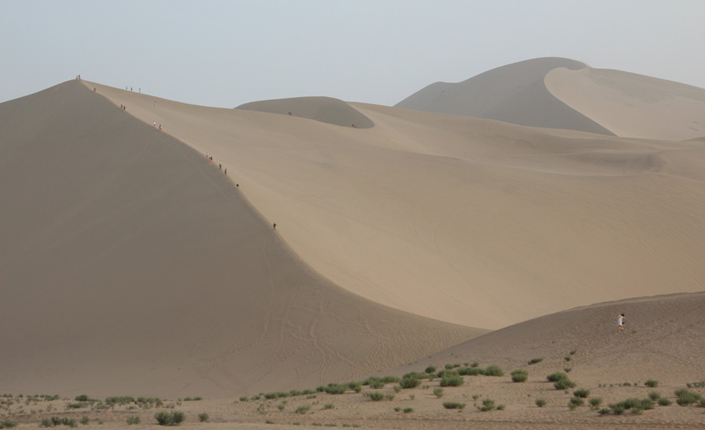 由于山勢(shì)陡峭,攀登只能緩緩而上。下山時(shí),沙粒會(huì)隨人流動(dòng),發(fā)出管弦鼓樂般的隆隆聲響,真是扣人心弦。